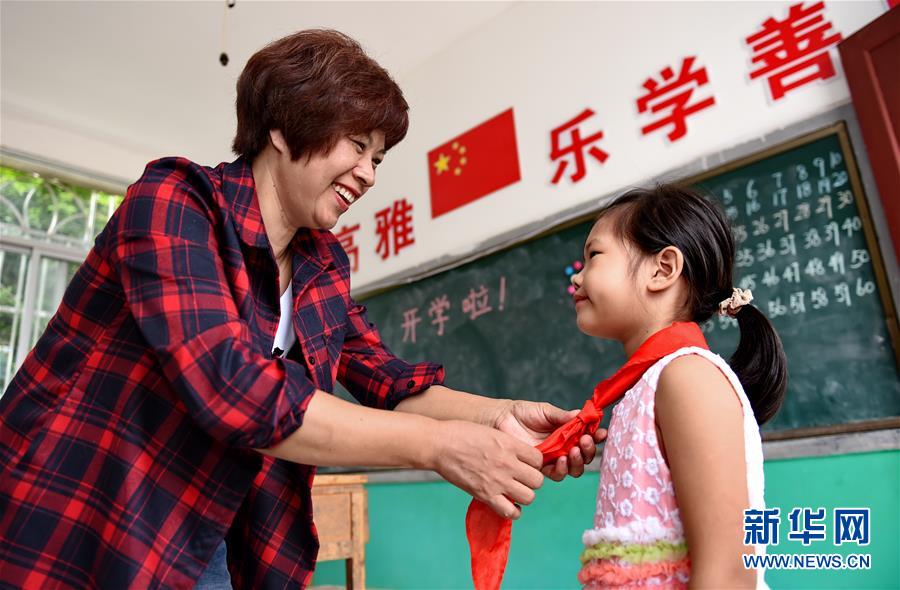 福建永泰县赤溪乡荷溪教学点老师程桂英为二年级学生雷秀彬(右)佩戴红领巾(2016年9月1日摄)。