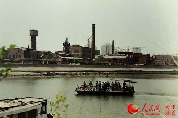 改革开放初期的海河摆渡情景,照片中还能够看到河边遍布的工厂。王海冰/摄