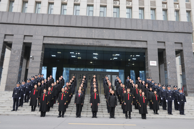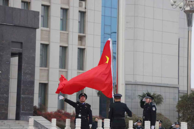 上午8时30分,司法警察护旗方队步伐铿锵,护卫国旗入场。在庄严的国歌声中,鲜艳的五星红旗冉冉升起,全体干警面向国旗肃立行注目礼,表达对祖国的无限忠诚与热爱。