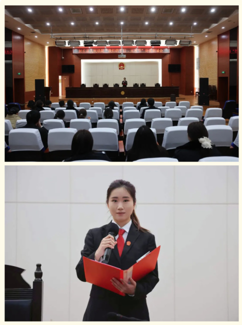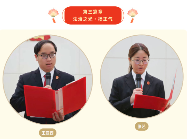 作为法院人,守护公平正义是永恒的天职,干警王亚西、张艺通过声情并茂的朗诵展现法院人的使命担当。《法治颂》以排山倒海的排比,将法治与国家、人民、未来紧密相连,“把所有的希望都交给法治”掷地有声;《法治春天》则从晨曦中的国徽起笔,描绘了法治在神州大地生根发芽的蓬勃景象,“以事实为依据,以法律为准绳,把公平正义写在这片深情的土地上”道出了全体法院人的庄严承诺。