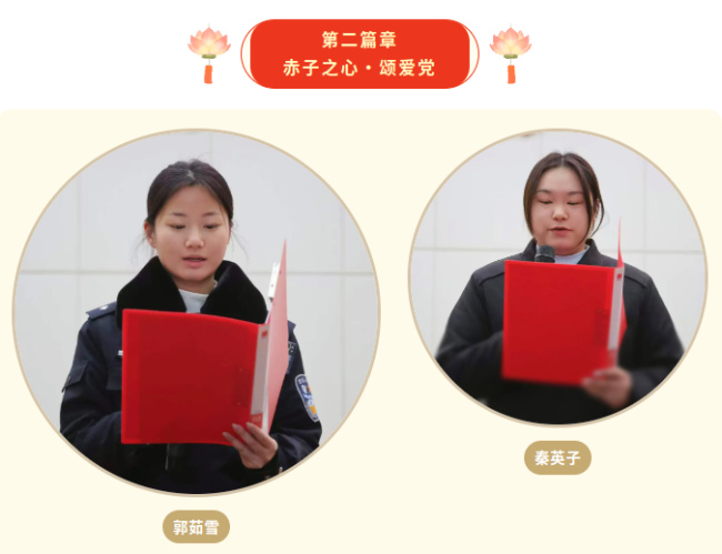 从团圆之夜到百年征程,干警郭茹雪、秦英子用深情的朗诵表达对党的赤诚。《党旗颂》以“你有晨曦一样的颜色”开篇,讴歌了镰刀铁锤的力量和共产党人不变的初心;《把一切献给党》则以“跟你走”为主线,道出了千千万万党员追随党、奉献一切的坚定决心。“千里万里我也不回头,千年万年我也不回头”——铿锵的誓言在会场久久回荡。